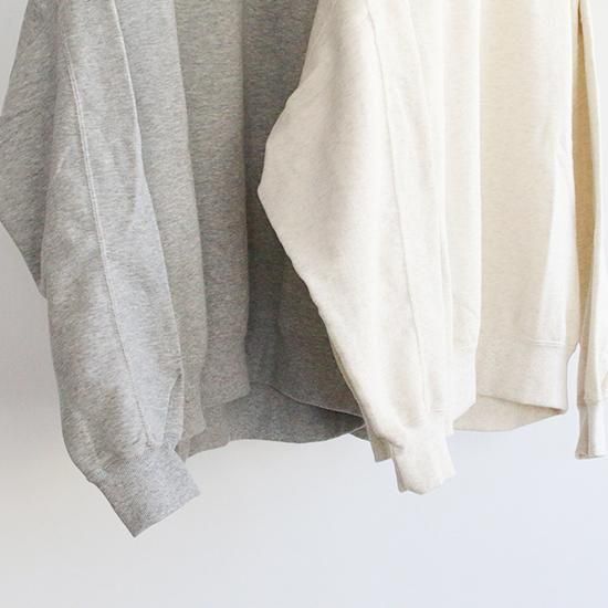 素材と背景にこだわって作ったオリジナルのハイゲージ裏毛。弾力とストレッチ性、またソフトな肌触りが心地良いループ双糸によるふっくらとした仕上がりにこだわりました。度詰めに編むことで出る控えめな光沢からも上質さがうかがえます。